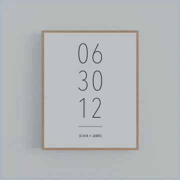 Ein Hochzeitsdatum-Kunstwerk ist eine wunderschöne Erinnerung an den besonderen Tag, der euer Leben für immer verändert hat. Diese personalisierte Kreation hält euren Hochzeitstag auf elegante Weise fest und wird sie jeden Tag daran erinnern, wie eure gemeinsame Geschichte begann. Zeitlos und bedeutungsvoll - ein Geschenk mit persönlicher Note, das direkt ins Herz trifft.